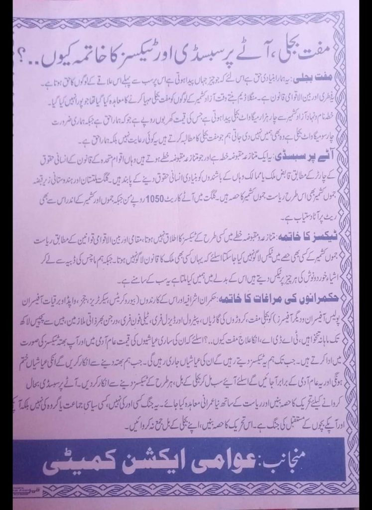 جائنٹ ایکشن کمیٹی پاکستانی مقبوضہ جموں کشمیر کی جانب سے چارٹر آف ڈیمانڈ جاری کرتے ہوئے مفت بجلی، آٹے پر سبسڈی، ٹیکس کے خاتمے اور حکمرانوں کی مراعات کے خاتمے کی مانگ کی ہے۔